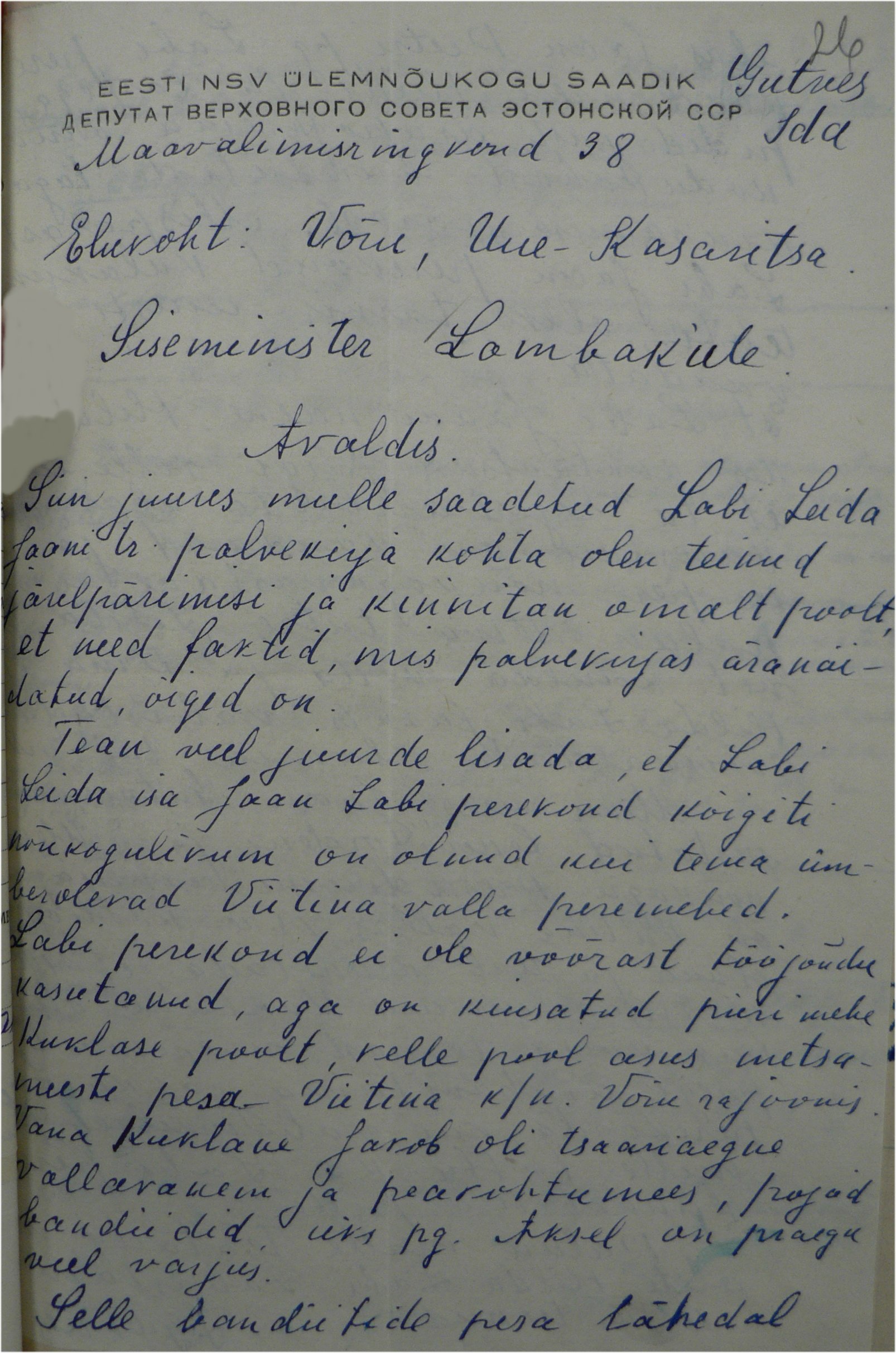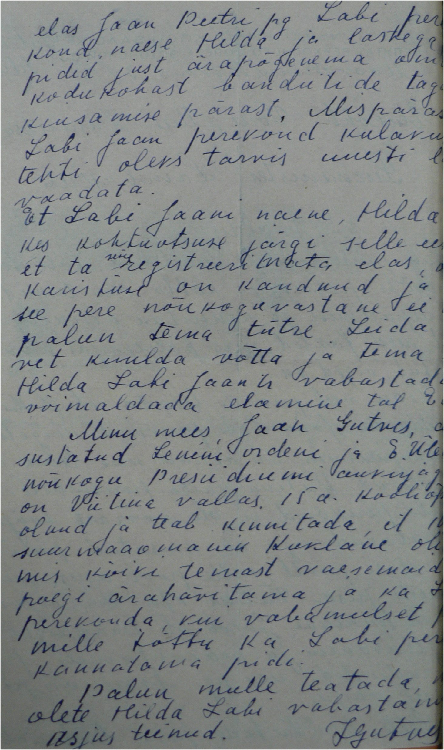 sissekirjutuse puudumine Võrus elades. Hilda Labi eestkostjaks palus tema pere parteitšinovniku, ülemnõukogu saadiku