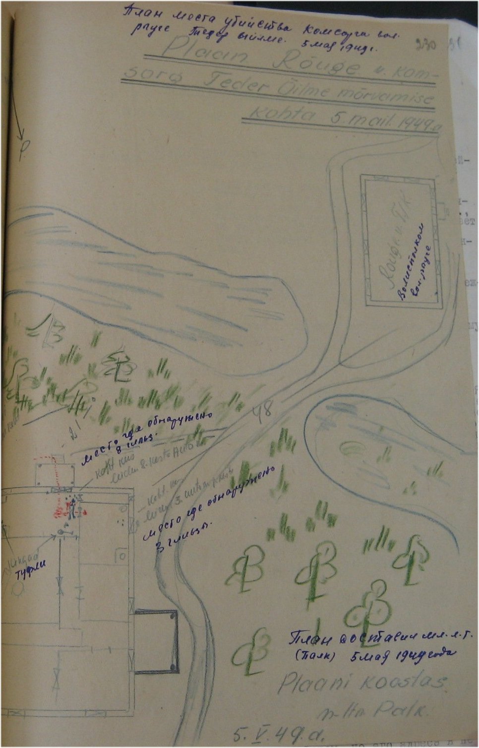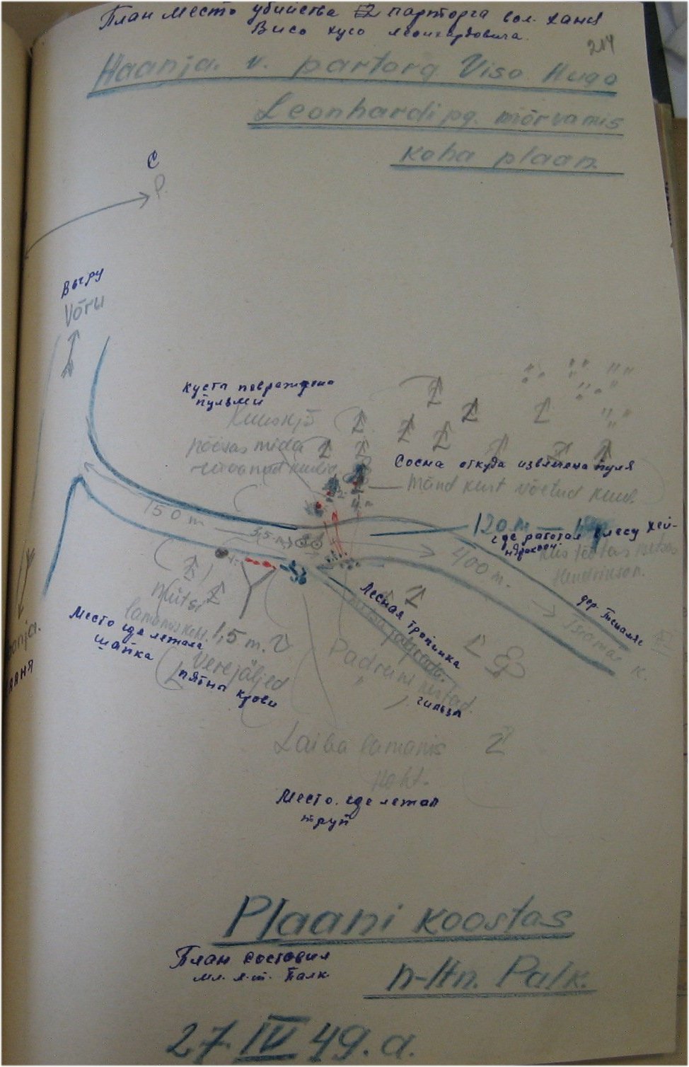 Laine Voldemar viidi metsa, u 200 m rajast paremat kätt. Seal korraldati talle ülekuulamine (u 10-15 min), et teada