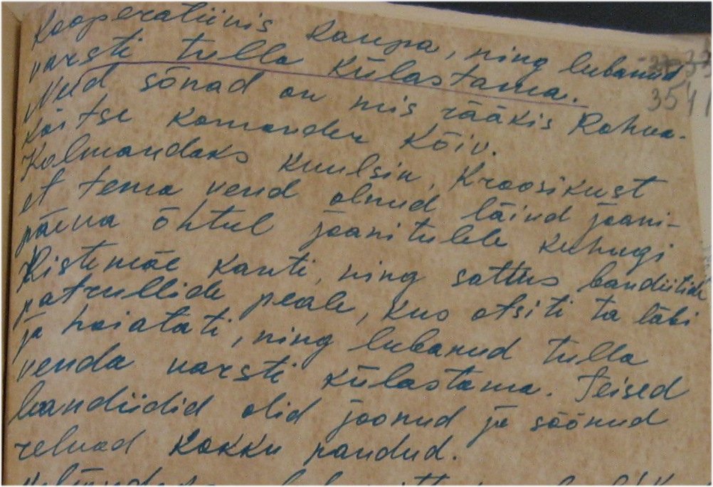 Umbes kell 1 öösel tulid Pihlapuu ja Uibo külast tagasi ja rääkisid, et Sadra külas oma venna talus on parajasti