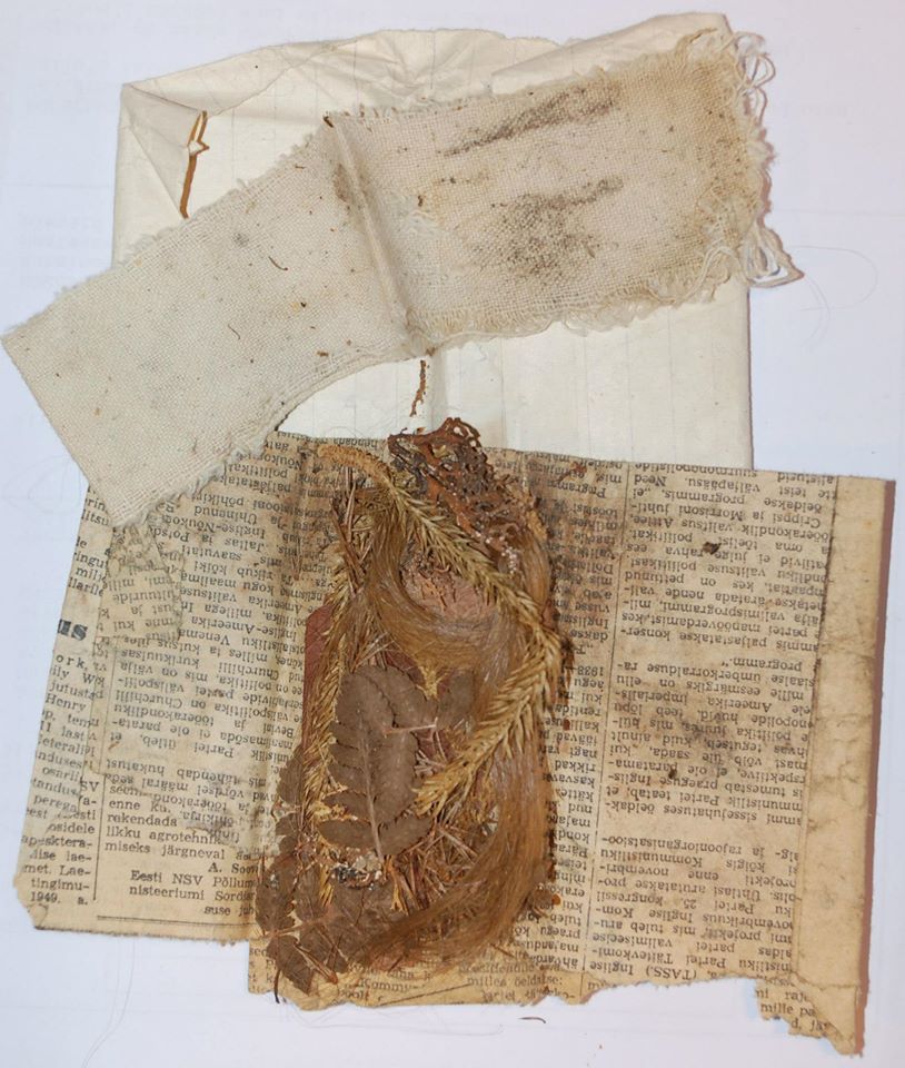 Viimase kallima juuksekihar koos langemiskohast korjatud taimedega ja riba "Toomase" riietest. 63 ja pool aastat hiljem, kui hoidja lokid on juba ammu valged.