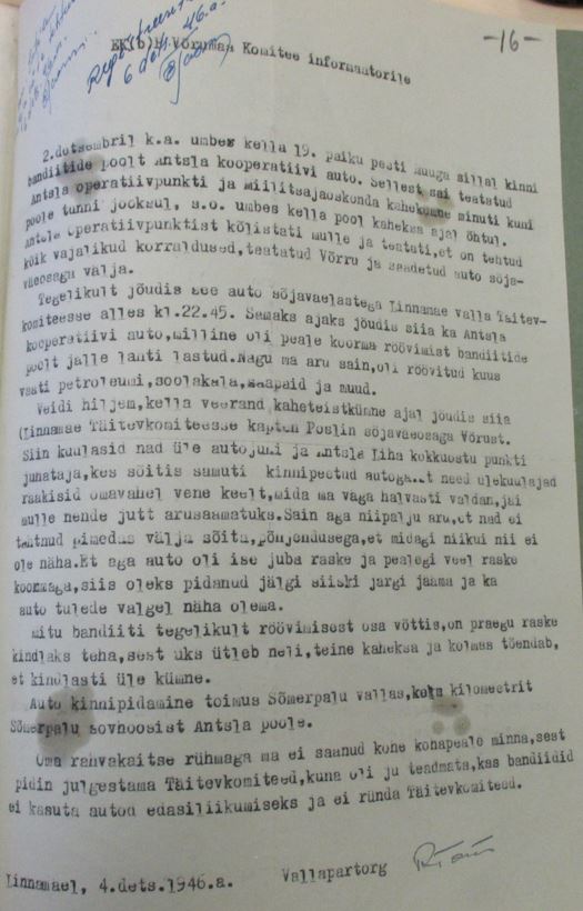 Uue-Antsla võitehase juhtaja 1944-1947 LA: Nägin õuel 5-6 vankrit, kui palju oli inimesi, ma ei tea. Magasin juba, kui kuulsin õues hääli. Naine avas ukse ja röövlid tulid tuppa. Osa neist tulid läbi katki löödud koridoriakna. Naiselt nõuti võitööstuse võtit, et kui ei anna, viskavad granaadi korterisse. Andsin võtme, nad käskisid mul endile järgneda. Õues võikeldri juures nägin kolme sõjaväevormis meest. Nad avasid võtmega ukse ja kandsid või vankritesse. Vanker täis laaditud, sõitsid nad minema. Mind hoitatati hommikuni toast lahkumast. Hommikul läksin piiritusetehasesse helistama, kuid telefoniliin oli lõhutud. Võid võeti u 100 kg. Ise nägin 3 röövlit, kui palju neid kokku oli, ei tea.