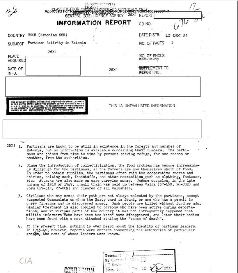 1. Partisanid on Eesti metsades ja rabades endiselt olemas, kuid nende arvu kohta pole mingit teavet. Aeg-ajalt ühinevad partisanid ühel või teisel põhjusel võimude eest varjupaika otsivate inimestega. 2. Alates kollektiviseerimise algusest on toiduprobleem muutunud partisanide jaoks järjest tõsisemaks, kuna talupidajatel endil napib toitu. Enda varustamiseks korraldava partisanid sageli rünnakuid kooperatiivkauplustele, meiereidele, võttes sealt raha, toidukraami jm eluks vajalikku nagu riideid, jalanõusid jne. Samuti rünnatakse autosid, mis veavad raha. Ühel juhtumil, 1948 või 1949 aasta hilissügisel peeti kinni postirong Valga (57-46N, 26-03E) ja Võru (57-51N, 27-00E) vahel ja tühjendati kõigest väärtuslikust. 3. Nende teele juhuslikult sattuvaid tsiviilisikuid partisanid reeglina ei ahista, kui nad pole just kahtustatavad kommunistid, kellelt leitakse parti liikmepilet või kellel on relvakandmise luba ja kellelt leitakse relv. Sellised tapetakse pikemalt mõtlemata. Sama kohtlemine saab osaks inimestele, kes olid aktiivsed osalised küüditamistel ja riigi erinevates osades on tihti juhtunud, et liigagarad sõjaväelaste informaatorid on “jäänud kadunuks” ja leitud hiljem koos juuresoleva teatega “surma põhjusest”. 4. Praegusel ajal pole kuulda, kes on partisanide juhid. Aastatel 1945-1946 tuli pidevalt teateid kindlate partisanirühmituste tegevusest, mille juhtide nimed olid teada.