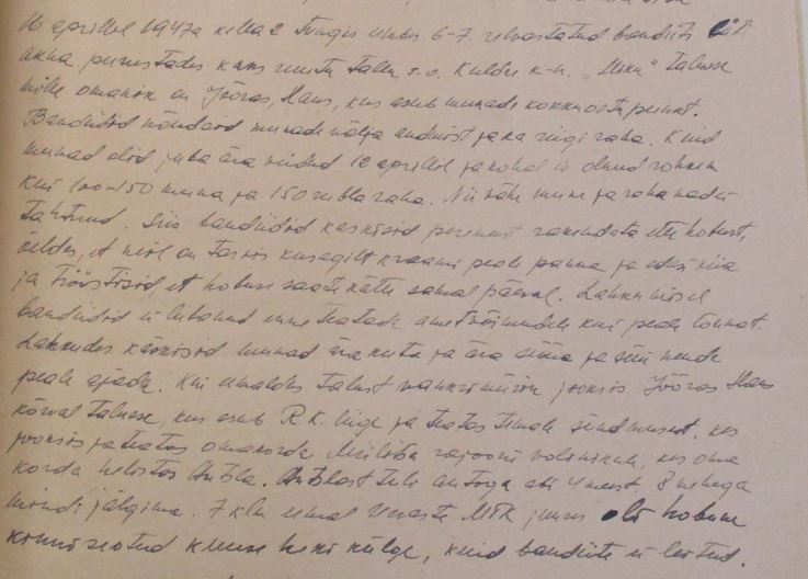 Raamatupidaja TE:töötades raamatupidamise praktikandina Sõmerpalu sovhoosis, komandeeriti mind Võru riigipanka sovhoosile 1946. a detsembrikuu palkade väljamaksmiseks raha tooma. Saanud selle raha summas 28 277 rbl, sõitsin u kl 2-3 päeval sovhoosi autoga tagasi sovhoosi. U 2 km enne sovhoosi jõudmist peatasid mind viis automaatide ja vintpüssidega relvastatud tundmatut, neist 1 naine. Mõnedel meestel olid maskid, mõned näod olid kaetud mingi musta võidega.