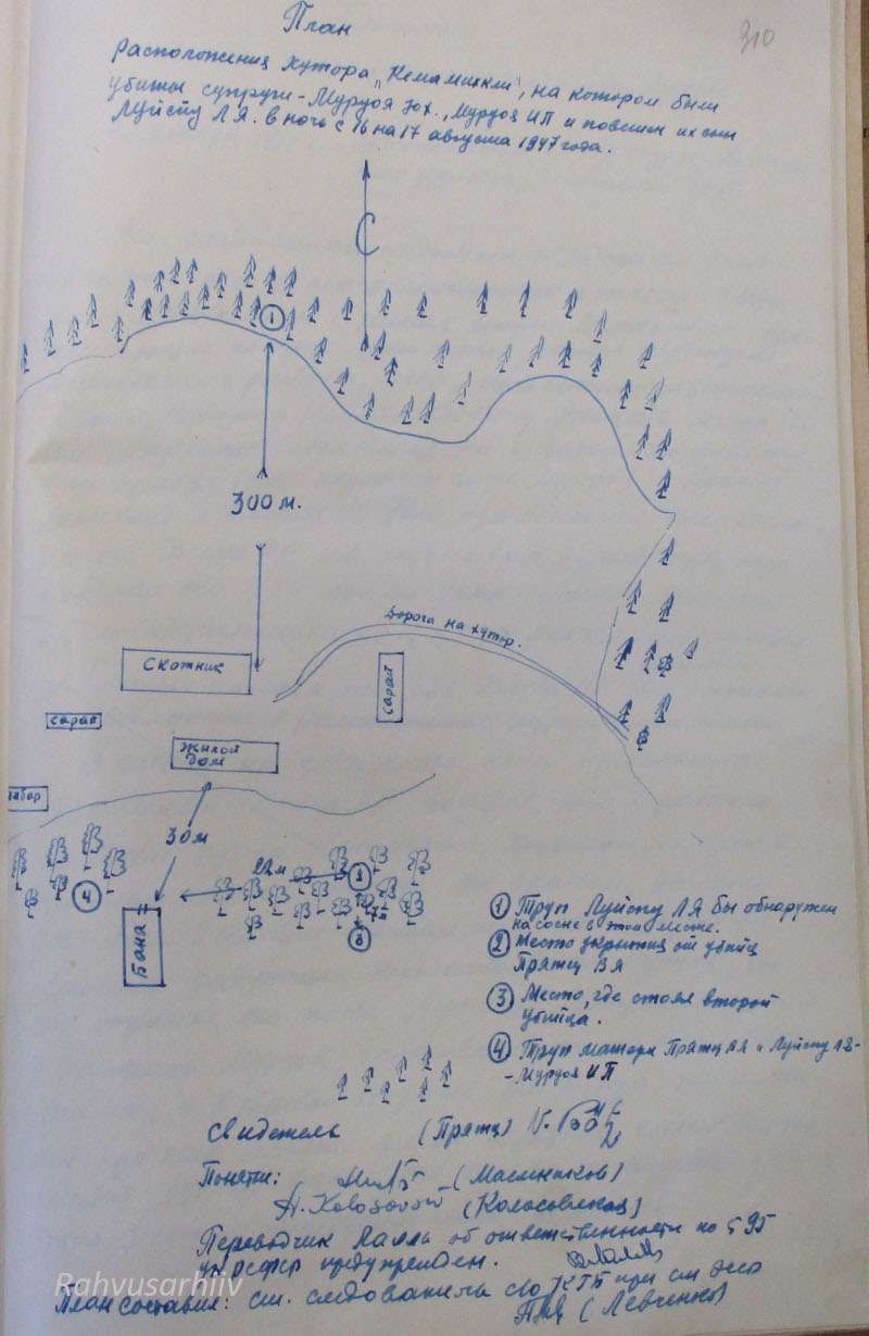 Vahemaa Keema-Mihkli talu ja avastatud laiba vahel (talust põhjas) oli 300 m. Kott, millega ta, so Luispuu, rukist kandis, leiti Linnamäe miilitsaosakonna voliniku sm Orti poolt Muruoja tapmise järgsel päeval põõsastes Rehkli talu poole suunduval teel, u 500m Keema-Mihkli talust, so laiba asukoha suunast risti vastassuunas.