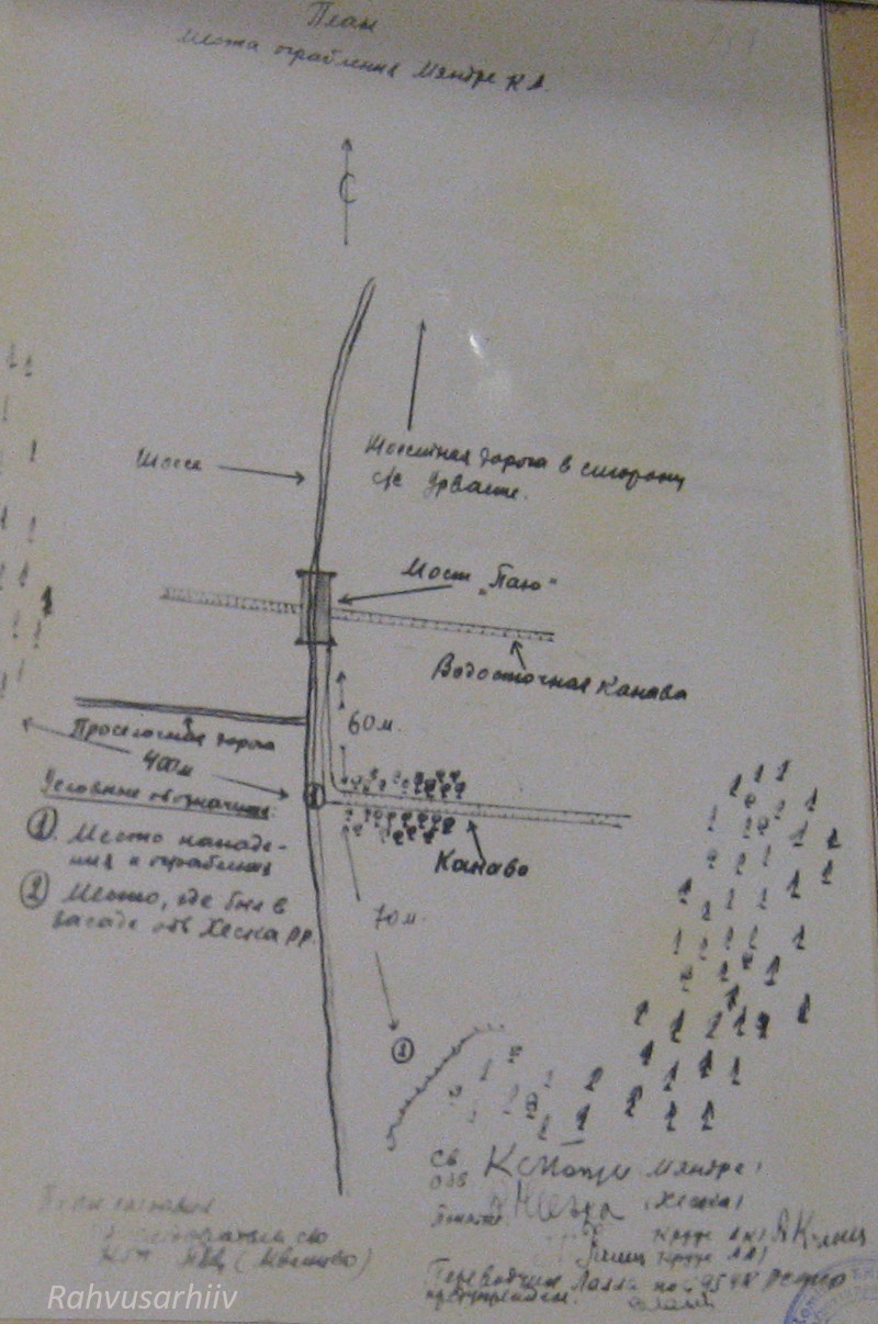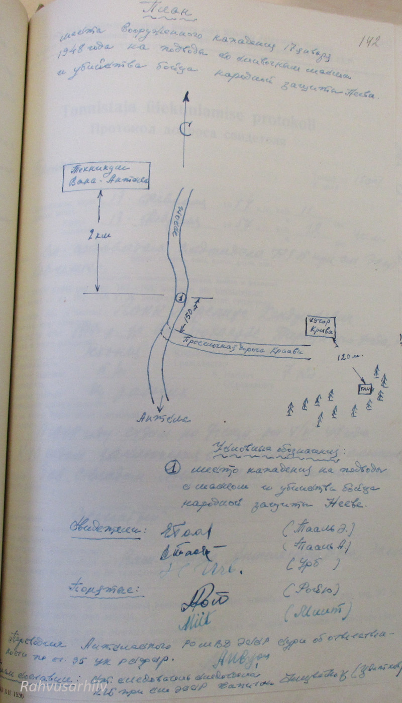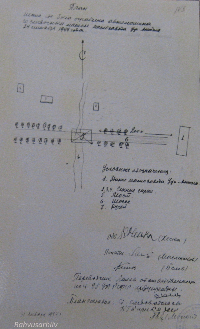 1948. a 2. dets mina, RJM organite raudteevalitsuse ülema asetäitja alampolkovnik Tšurbanov, koos sama valitsuse ülema asetäitja alampolkovnik Levini, 2. jaoskonna 3. osakonna ülem van ltn Žbanovi, van oper volinik n ltn Tihhomirovi ja uurimisosakonna ülem kpt Tšurnjaviniga viisime läbi sünduskoha ülevaatuse raudteel ja selle ümbruskonnas: