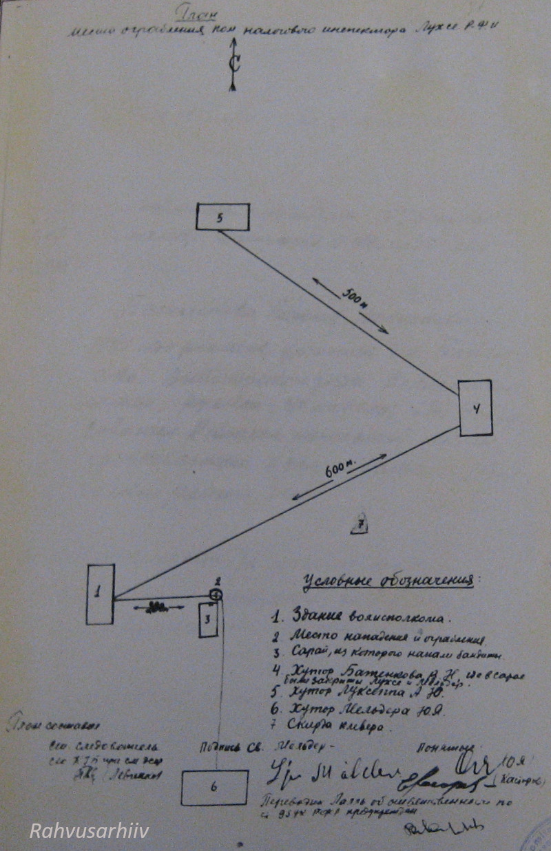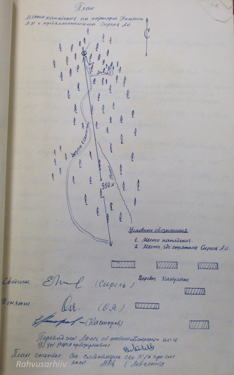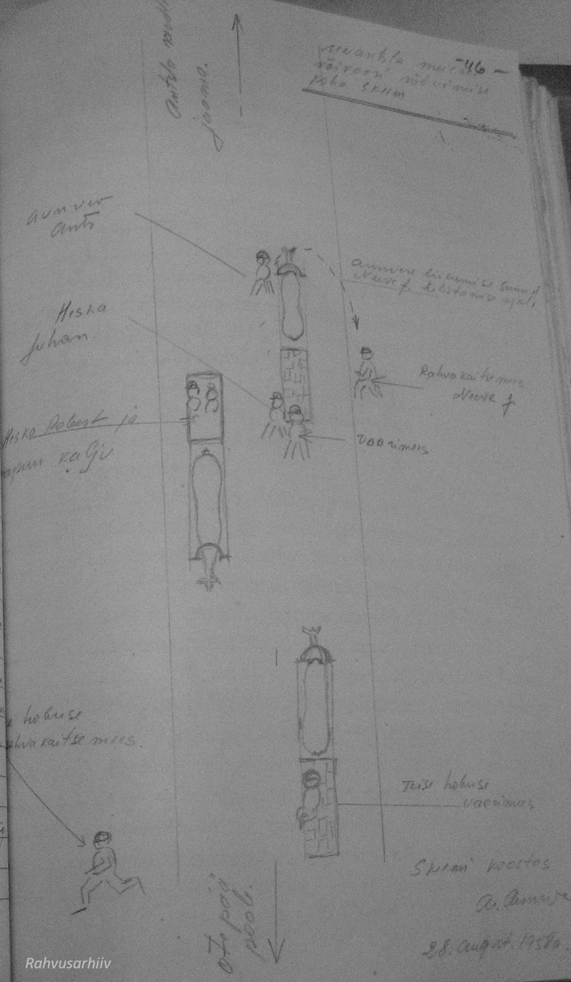 1948. a 2. dets mina, RJM organite raudteevalitsuse ülema asetäitja alampolkovnik Tšurbanov, koos sama valitsuse ülema asetäitja alampolkovnik Levini, 2. jaoskonna 3. osakonna ülem van ltn Žbanovi, van oper volinik n ltn Tihhomirovi ja uurimisosakonna ülem kpt Tšurnjaviniga viisime läbi sünduskoha ülevaatuse raudteel ja selle ümbruskonnas: