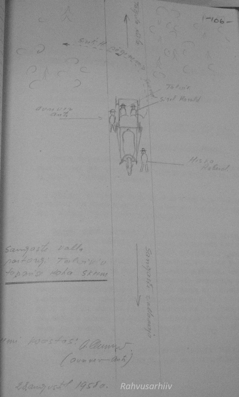 Üks pikk Saksa mundris Saksa nööpidega mõlemal hõlmal, teine keskmist kasvu. Kuulsin kahte lasku. Sauna lähedal seisis teine relvastatud mees, kes ütles vene keeles: “товарищ, скорей, скорей!“