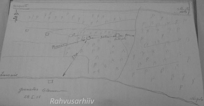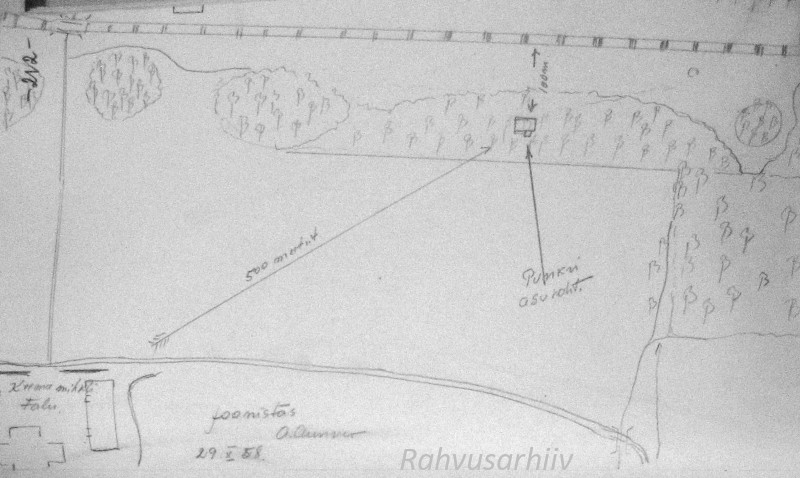 AA: Teine punker, kus varjasin end Reinumäega kuni asumiseni Kose rajooni 1953. a, asus vanal sooalal Koorastes. Punker asus u 300 m Kulli talust soometsas sooseljandikul. Mis külla talu kuulus ja kes seal elas, ma ei tea. Selle talu elanikud ei teadnud meie punkri olemasolust midagi. Punker oli u 2x2 m suur, seest puitplaatidega kaetud. Ka Kooraste punker oli maa-alune ja hoolikalt maskeeritud. Seal punkris elasime Reinumägi Ainoga kuni 1953. a sügiseni. Okt. 1953, pärast endale passi tegemist, sõitsin Kose rajooni, kus hakkasin teedeehitusel tööle. Umbes kolme nädala pärast tõin enda juurde ka Reinumägi Aino, kes seni elas edasi punkris Kooraste vallas. Sellest ajast peale olen elanud Kariste nime all.