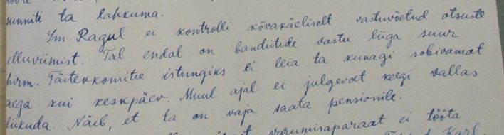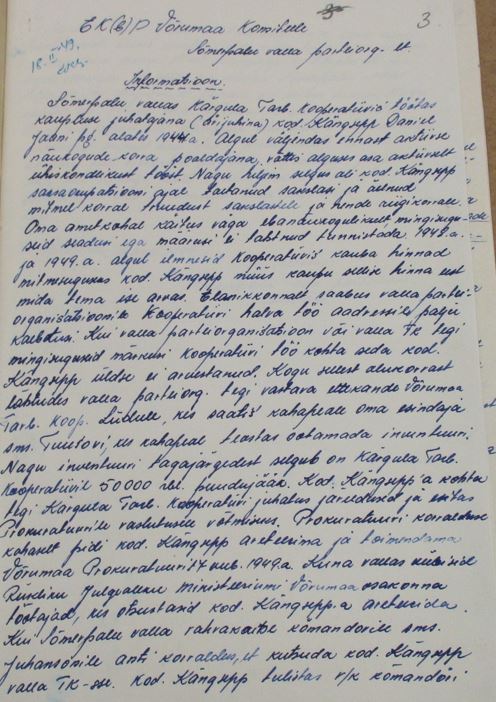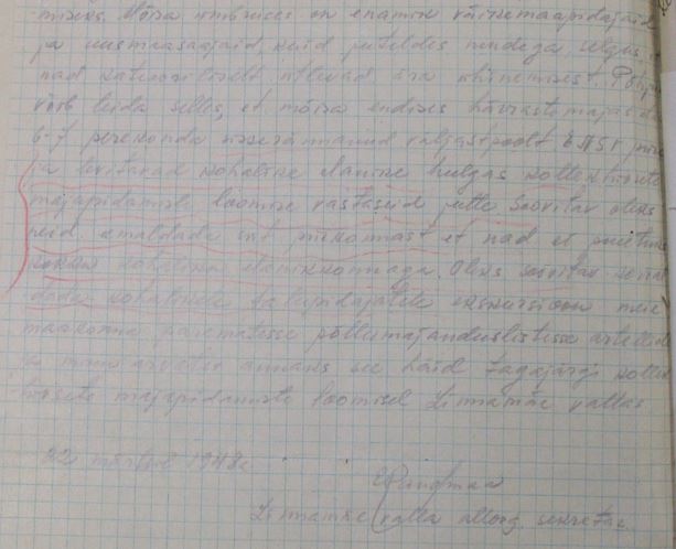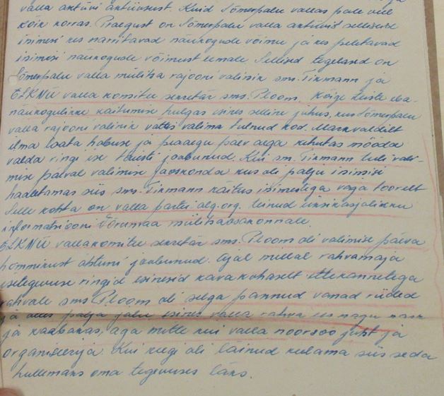 TK ruumides pole relvastatud valvet. Sm Ragul ütleb, et ta on korduvalt nõudnud kuid kõik on asjata. Sm Lepistu peaks viivitamatult niisukuse olukorra likviteerima muidu kui on hilja. Punast nurka TK ruumides ültse pole komsorg Oss pole ka sellele mingit tähelepanu pööranud. On ainult paar katkist ja tolmust määrdinud pilti ahju taga. Ma palun kui teil on sääl võimalik siis saatke minule punast riiet loosungeid ja mõni pilt sest nagu jutu ajamisel selgus on sm Stalini pilt kogu raamiga ära varastatud. Komsorg Oss Ilmar on haige ja juba üle kuu puudub. See aga ei takista teda järvel kalu püüdmast ja pidudel käimast. Tahab vabaneda komsomoli tööst.